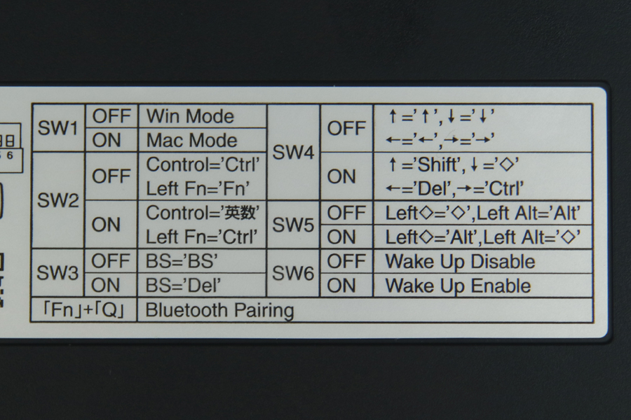 底面のDIPスイッチを使って、Macモードに切り替えたり、左のFnキーをCtrlキーに変更したりできる。対応OSはWindows Vista SP1以降、Mac OS X v10.5以降、iOS 7.1以降、Android 4.0以降となっている。
