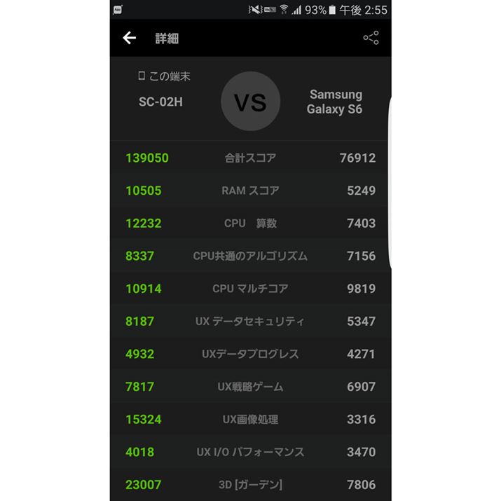 Antutuベンチマークの結果。左がGalaxy S7 edgeのもので総合スコア139050、右がひとつ前の世代にあたるGalaxy S6 edgeのもので、総合スコアは76912。3D描画のスコアでも大差がついた