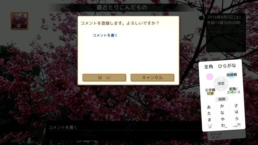 各写真や動画ごとにコメントを書き込める機能も。アプリからも行え、これを使うと文字入力がラク