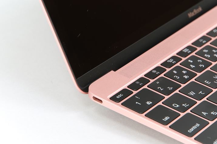 第2世代となる新しいMacBookは、デザインは従来モデルから変わっていない。厚さ13.1mm、重量が920gという超薄型・軽量ボディで、Macのノートパソコンの中では一番薄くて軽いモデルだ。超薄型だが、アルミニウム素材を使ったボディは剛性感があり、安心して持ち歩ける。手触りもいい。新色のローズゴールドだが、実物はホームページで見るよりも落ち着いた色味で、男性が持っても違和感のない仕上がりとなっている。底面のネジまで同じ色に塗装されているのは、さすがアップルといったところ。「iPhone」も同じローズゴールドにそろえてみるのもいいだろう。