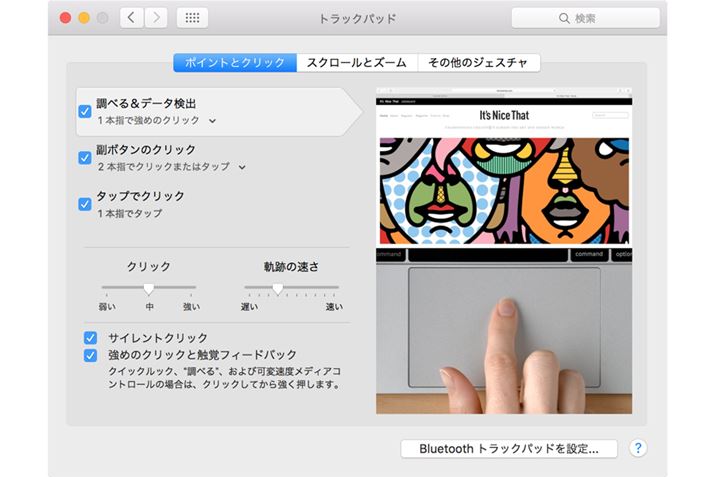 感圧タッチトラックパッドは、初期設定ではタップでクリックできないようになっているので、タップでクリックしたい場合は有効にしておくといいだろう。「サイレントクリック」を有効にすると、クリック音が小さくなる。図書館や飛行機など、静かな場所で使う場合は有効にしておきたい