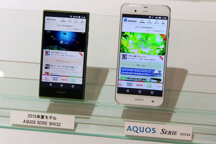 2015年夏モデルの「AQUOS SERIE SHV32」(左)と最新の「AQUOS SERIE SHV34」(右)。EDGESTスタイルをやめ、標準的なスタイルに変わった