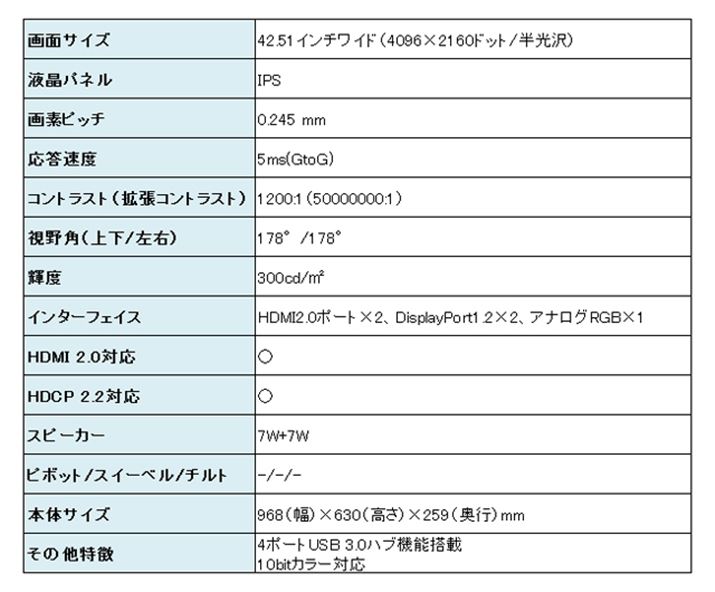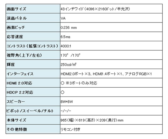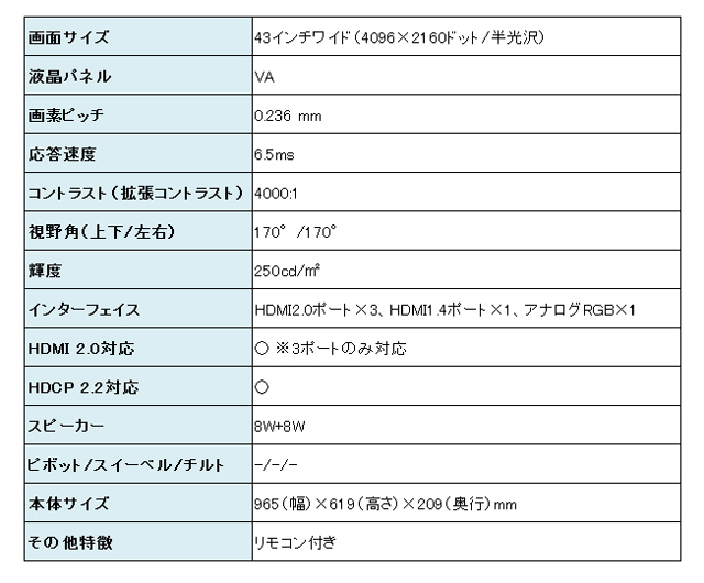 ドウシシャの「D431US」は、今回紹介する製品でもっとも大きい43インチの超大型4Kディスプレイだ。入力インターフェイスはHDMI×4とアナログRGB×1のみ、HDMIはCEC対応、遠隔操作用リモコンを付属するなど、まるで4K液晶テレビのような製品だ。DisplayPortが未搭載のため、組み合わせるパソコンによっては4Kのフルスペックを利用できない場合があり、パソコン用のディスプレイとしてはやや使いにくい部分はあるが、4Kチューナーやゲーム機などのマルチデバイスを接続して使う場合は、かなり便利に使えそうだ。