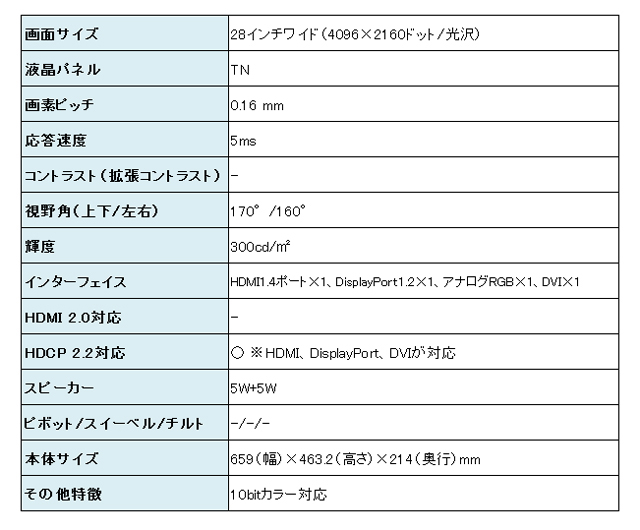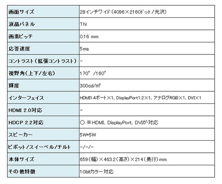 2016年6月3日時点の価格.comに登録されている4K液晶ディスプレイの中で最も安価に購入できる4K液晶ディスプレイが、アトランティスの「JAPANNEXT JN-T280UHD」だ。画面サイズは28インチワイド。パソコン向けの4K液晶ディスプレイとしてはめずらしく、グレアパネルを採用している。液晶パネルはTN方式で、オーバードライブ機能により、応答速度2.5msを実現。10bitカラーにも対応している。HDMIが2.0未対応のため、4Kチューナー等は接続できないものの、4万円を切る価格は魅力的だ。
