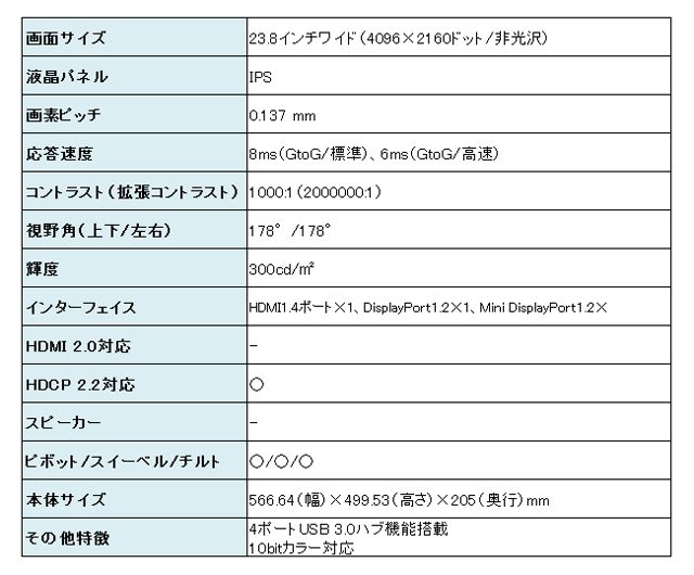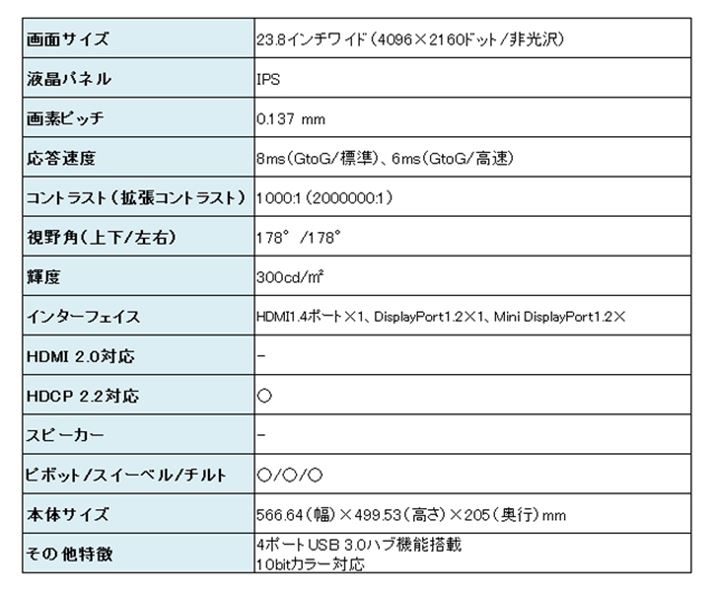 デル「P2415Q」は、4K液晶ディスプレイとしては比較的コンパクトな23.8インチワイドサイズの製品だ。液晶パネルはIPSで、色域はRGB 99%をカバー。工場出荷時にカラー調整を実施しているほか、輝点ドット抜けを保証するプレミアムパネル保証が標準で3年間つくのもうれしいポイントだ。また、デルの液晶ディスプレイらしく、角度や高さの調節、ピボット機構を利用した縦画面への対応など、スタンドが非常に多機能なところも見逃せない。インターフェイスは、MiniDisplayPort、DisplayPort、DisplayPort出力、HDMIを各1系統備えており、デイジーチェーン接続にも対応する。尖ったところはないが、デルらしいそつなくまとまった製品といえる。小型の4Kディスプレイを比較的低価格で導入したいという人には、この「P2415Q」は有力な選択肢になるだろう。