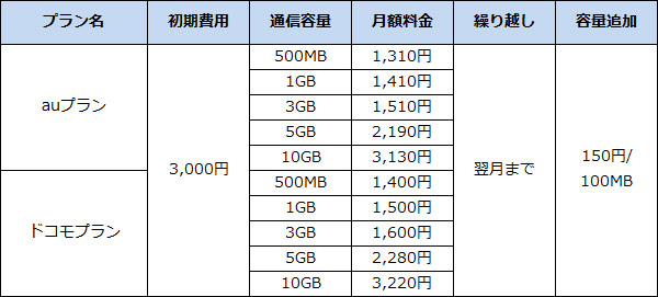 KDDIの関連会社である「UQコミュニケーションズ」は、モバイルデータ通信のWiMAXサービスに加えて、auの回線網を専門に扱うMVNOでもある。音声通話付きSIMカードのプランは、月間3GBの高速通信が可能な「データ高速+音声通話プラン」と、最大通信速度500kbpsに制限されるが通信容量無制限の「データ無制限+音声通話プラン」の2種類が用意される。通信容量無制限プランは、au系格安SIMカードでは唯一の選択肢になっている。