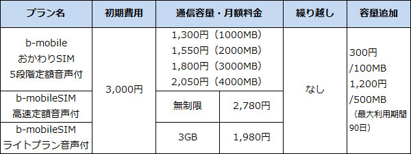 日本通信の音声通話付きSIMカードは、「b-mobile おかわりSIM 5段階定額 音声付」と、「b-mobile SIM高速定額 音声付」およびそのバリエーションの「b-mobile SIMライトプラン 音声付」の3種類から選ぶことができる。いずれもNTTドコモのネットワークを使用している。