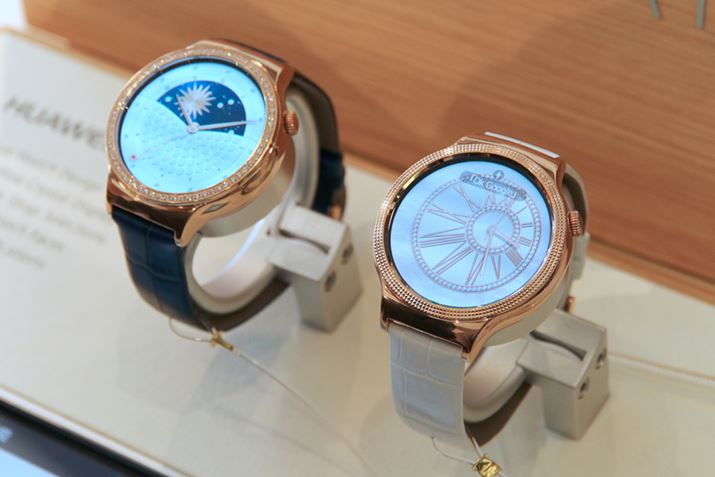 女性向けのスマートウォッチ「HUAWEI WATCH Elegant」(右、市場想定価格は税別61,800円)と「同 Jewel」(左、市場想定価格は税別72,800円)も発表。発売はHUAWEI P9と同じ6月17日