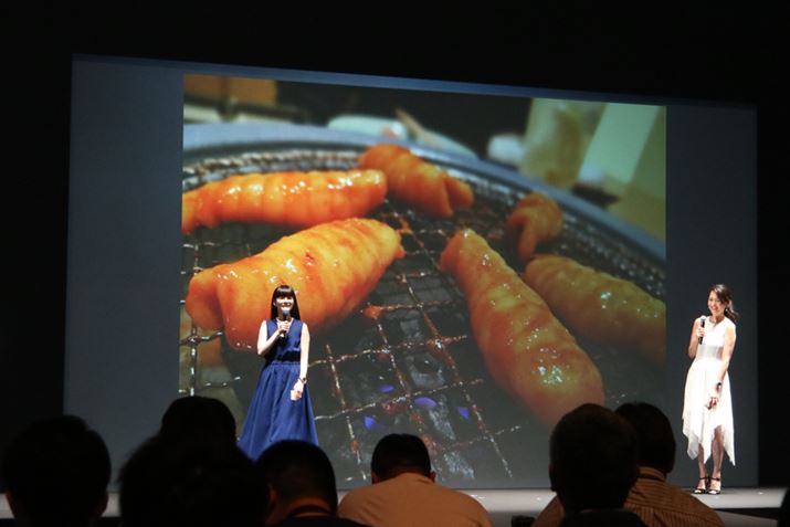 フリーアナウンサーの青木裕子さん(右)とモデルの秋元梢さん(左)もゲストとして登場。秋元さんは、しずる感のあるお肉の写真や最近ハマっている空の写真を、青木さんは2人のお子さんの写真を披露した