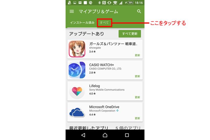 現在インストールされているアプリが一覧表示される。アンインストールしたアプリも含めて一覧表示させるには、「すべて」をタップする