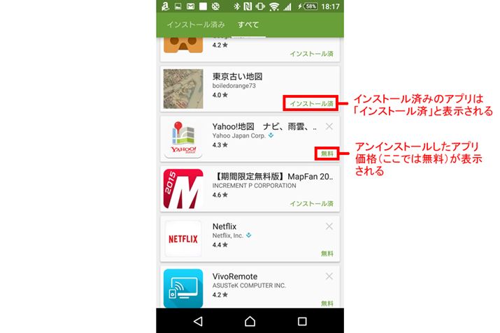 これまでにインストールしたアプリが一覧表示される。現在インストールされているものはアプリ名の右下に「インストール済」、アンインストールしたものは、同じ所に価格(ここでは無料)が表示される