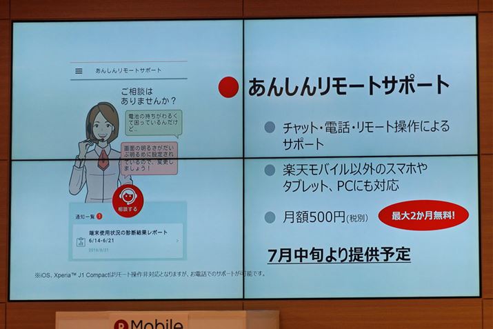 オプションサービスとしては、サポートサービス「あんしんリモートサポート」が7月中旬よりスタートする。これは、チャット、電話、リモートサービスを組み合わせたサポートで、楽天モバイルで購入した以外の、PCやスマートフォン、タブレットでも利用可能だ。月額500円だが、料金は最初の2か月は無料で利用可能。このほか、吹きこんだ留守電を自動でテキストデータにしてくれる「スマート留守電」(月額290円)も7月下旬に開始される。