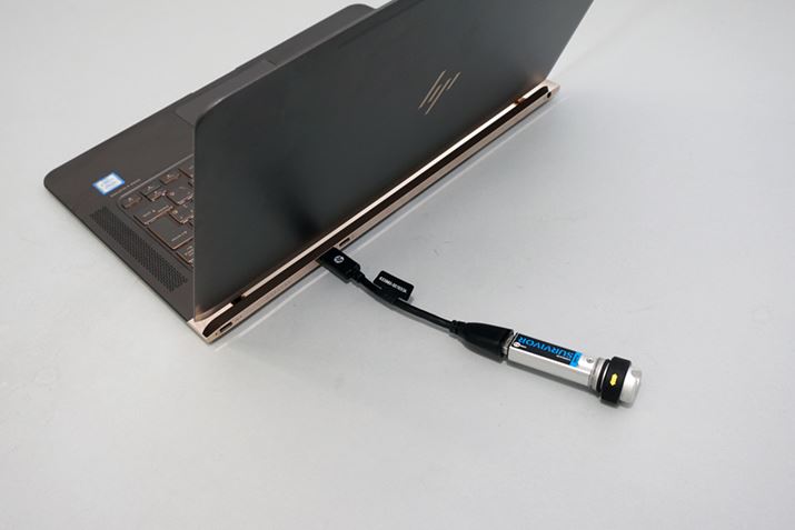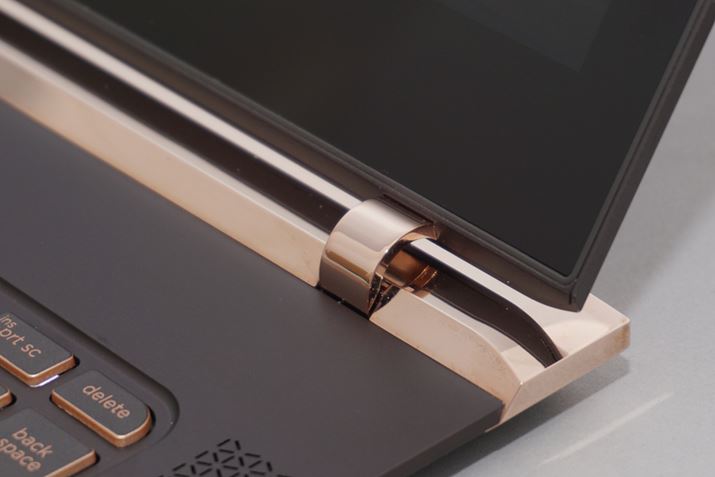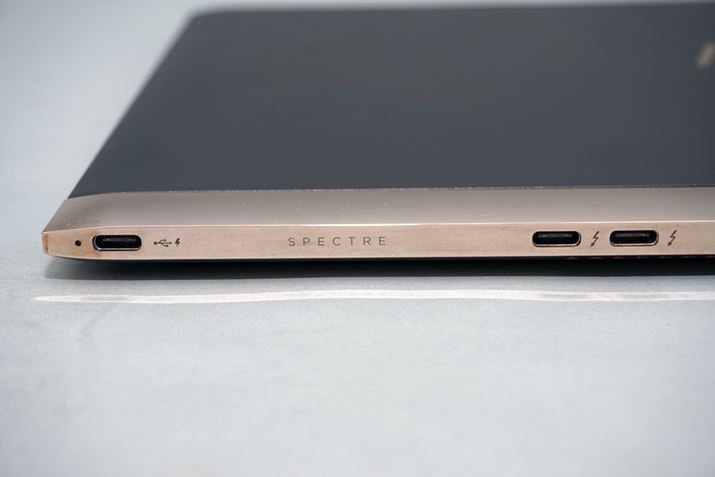 インターフェイスについては、液晶ディスプレイを支えるヒンジ部分に集約されており、本体を薄型化するためか、USB Type-Cポート3つとヘッドホン端子1つのみとかなりシンプルな構成となっている。AppleのMacBook最新モデルも、本体の薄型化のために厚みの増す余計なポートをすべて無くした潔い設計となっているが、Spectre 13も基本的な考え方はこれと同じといえる。USB Type-Cポートは電源ポートも兼用となっており、3つあるポートのどの場所に挿入しても、電源供給が行えるというなかなか面白いギミックだ。