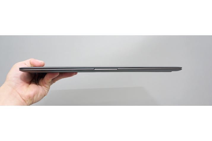 本体中央部で10.4mm、もっとも厚い部分でも11.2mmという極薄ボディを採用。クラムシェル型のWindowsノートPCでここまで薄い製品は初めてだ