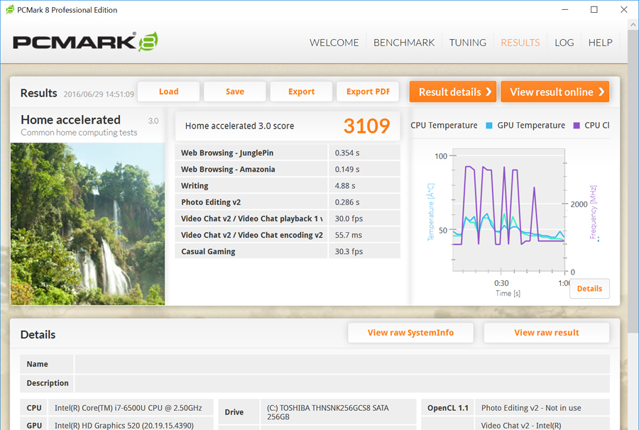 PCMark 8の結果。Home acceleratedでは3000オーバーのスコアだった。モバイルノートとしては優秀だ