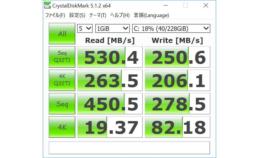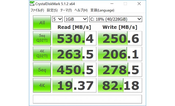 CrystalDiskMark 5.1.2 x64の結果。PCI Express接続のNVMe M.2 SSDと比べるとスコアは低いが、HDDよりレスポンスは快適だ