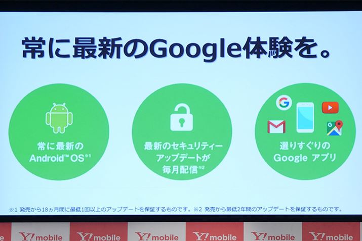 「常に最新のGoogle体験を。」とキャッチコピーがつけられたAndroid One。最新のOSが利用できる、毎月セキュリティアップデートが配信されるといった特徴がある