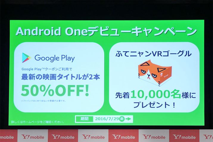 なお、本機の発売開始にともない、7月29日よりY!mobileでのAndroid Oneデビューキャンペーンもスタートする。Google Playにて配信されている最新の映画タイトル2本を半額でレンタルできるクーポンがもらえるほか、先着10,000名に手軽にVR体験ができる「ふてニャンVRゴーグル」がプレゼントされる。また、Y!mobileの2周年を記念したキャンペーンも続々開始される予定だ。