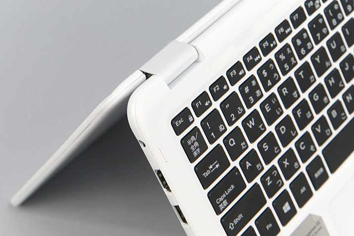 ヒンジは無段階で回転する仕組みで、好みの位置に固定できる。ヒンジ自体は小さくて目立たない作りだ。ヒンジのトルクは固めで、ディスプレイを開くときには少し力が必要となるが、スタンドスタイルやテントスタイルで使う場合に安定する。重量は約1.21kg(カタログスペック値)でタブレットとしては重いが、この価格帯の2in1タイプとしては標準的で、楽に持ち運べる。これからの季節、ドライブや旅行に出かける人も多いはずだ。そんなときに、タブレットスタイルでも使えるコンパクトな本モデルは重宝しそうだ。