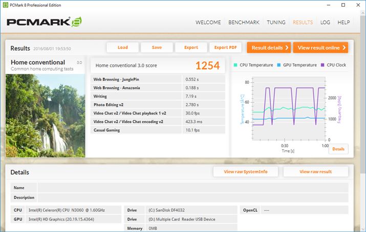 パソコンの総合的な性能を測る定番ベンチマークテストソフト「PCMark 8」(Futuremark)の結果。「Home accelerated」では1254と格安モデルとしては標準的なスコアだった