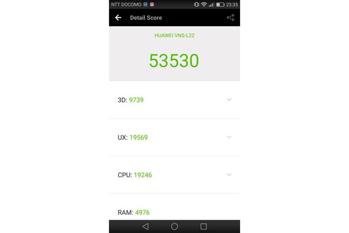 スマホのパフォーマンスを測定できる定番ベンチマークアプリ「AnTuTu Benchmark v6.2.0」の結果。上位モデルのP9の約半分のスコアだ。最新のハイスペックモデルに比べると、さすがに動作が遅く感じるシーンもあるが、日常使いで困ることはないだろう
