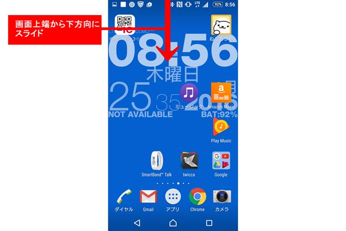 画面の一番上に色々なアプリからの通知アイコンが並んでいる。目ざわりになってきたら設定で非表示にしよう。まず画面上端から下方向にスライドさせて通知を表示する