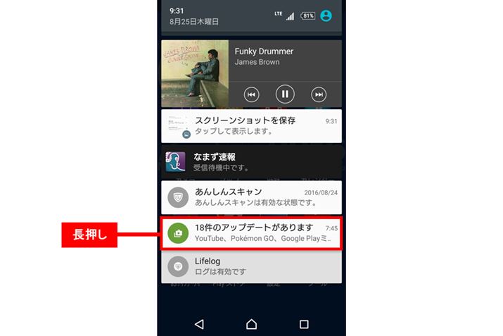 通知が表示されたら、通知アイコンを非表示にしたいアプリの通知を長押しする。ここでは「Google Play ストア」からのアップデートの通知を非表示にするため、「18件のアップデートがあります」を長押しする