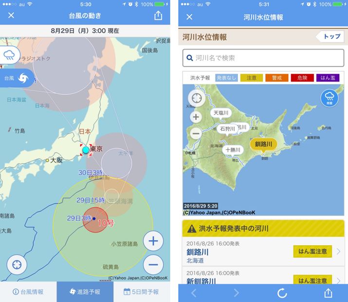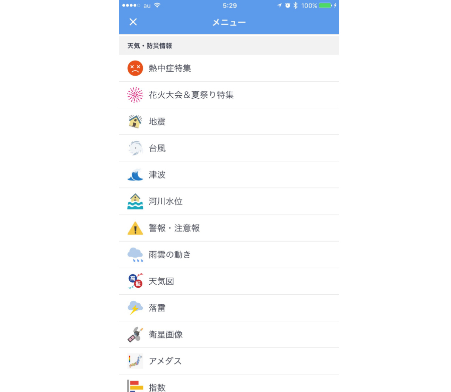 天気予報や雨雲レーダーはもちろん、台風情報も充実しているお天気アプリの大定番。台風情報では、台風の進路予報や5日間予報が用意され、詳細な情報をチェックできる。さらにメニューには、地震や台風、津波、河川水位などの防災情報を把握できる項目が用意されている。防災情報は全国で起きている情報が一覧で表示されるので、どの地方で災害が起きているのか把握するのに役立つ。