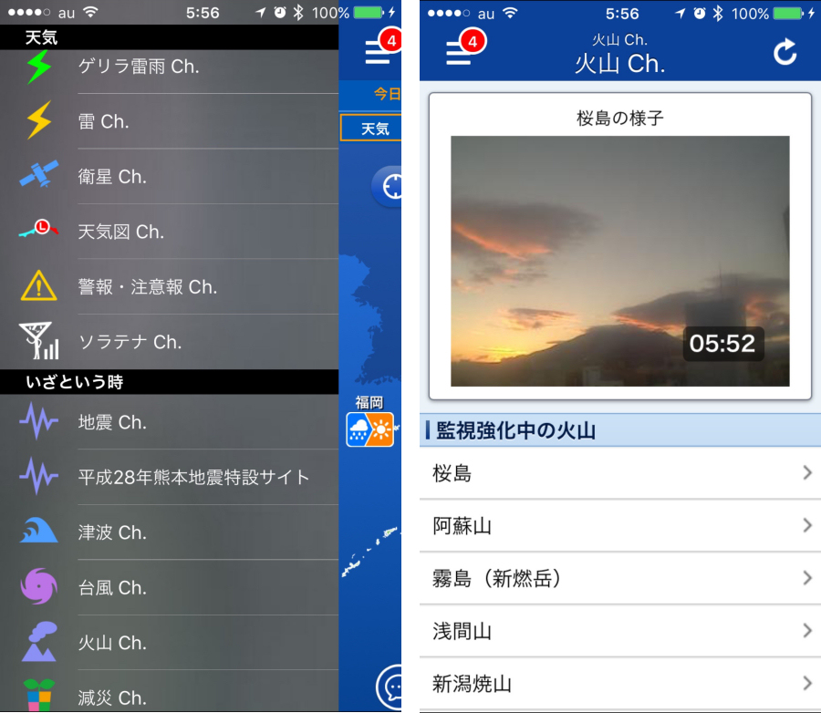 老舗のお天気アプリも天気に関するものから防災情報まで、さまざまな情報チャンネルが用意されている。台風情報では、会員向けに「3本の予想モデル」として、ウェザーニューズ、気象庁、JTWC(米国海・空軍合同台風警報センター)の3者が予想した台風の最新進路を比較して見られるようになっている。また、災害情報では、地震や津波、火山などのチャンネルが用意されていて、全国規模での情報チェックが可能だ。