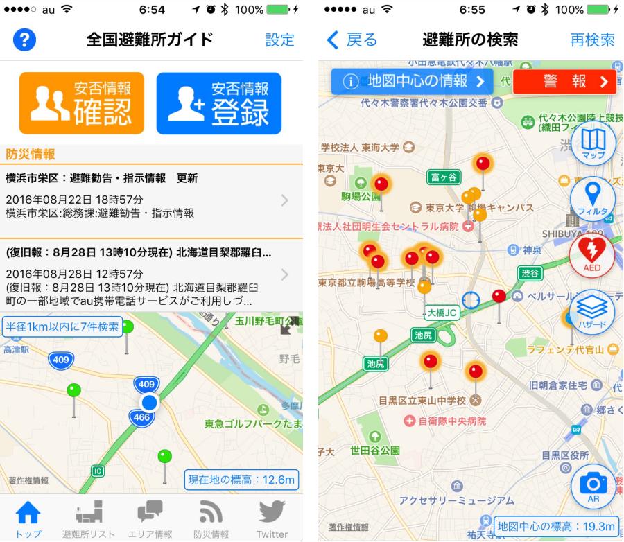 現在地の周辺にある避難所や防災情報を把握できる。地図をタップし、地図の中心周辺にある避難所も検索可能