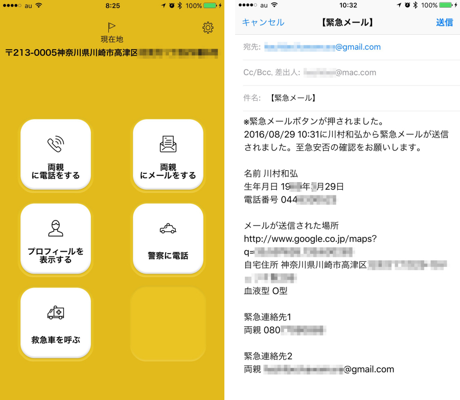 アプリを起動後、ボタンを数タップするだけで緊急電話やメールを発信可能