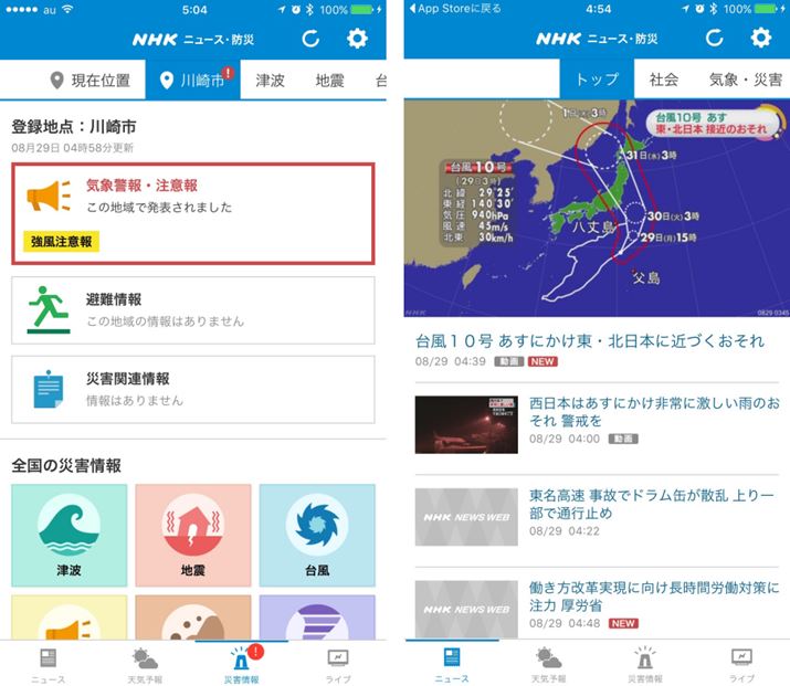 NHKが取材したさまざまなジャンルのニュースや各地の天気予報、災害情報が1つになった公式アプリ。社会・政治・ビジネスなどの気になる最新ニュースが読めるほか、地震や台風、津波、警報・注意報など、最新の災害情報も掲載。さらに災害発生時には、ライブ画面でテレビ放送の同時提供やライブ配信も行われる。最新の災害情報をチェックしたいときに役立つだろう。