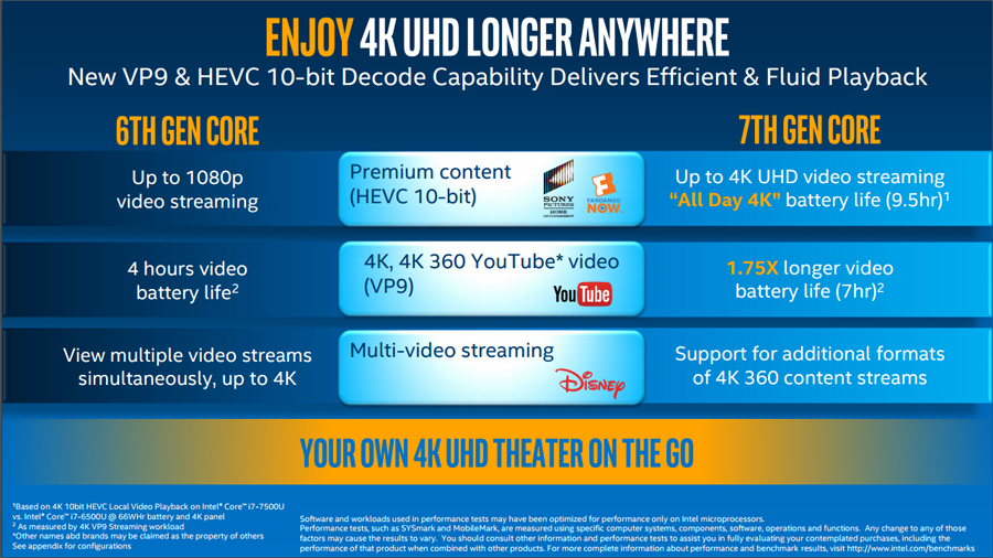 製造プロセスルールに改良が加えられた「Kaby Lake」では、動作クロックが引き上げられている。また、GPUに内蔵されているビデオエンジンにも手が加えられており、4K HEVC 10bitのデコードやエンコード、VP9のデコードなど、4K動画のサポート機能が強化されており、4K動画再生時のバッテリーパフォーマンスも向上しているという。