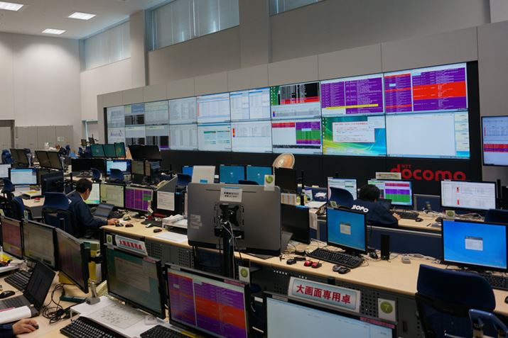 ネットワークオペレーションセンターは、大阪にある西日本オペレーションセンターとともに、基地局や交換機などを24時間365日体制で監視している