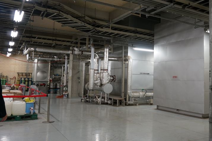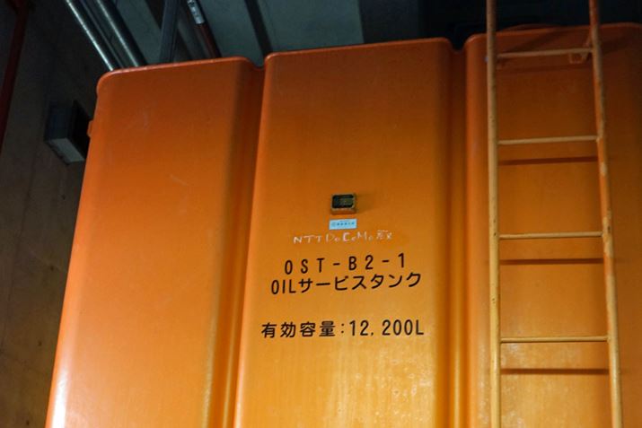 燃料タンクの一部、このほかに、地下に19万リットルの軽油が備蓄されており、20〜30時間分の燃料が確保されている。スペースの都合でこれ以上の備蓄は不可能だが、燃料の供給体制までセットで防災対策が構築されている