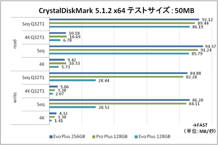 テストサイズ50MBのときのベンチマークデータ。4Kリード性能のみ「PRO Plus 128GB」が上回っているが、そのほかのシーケンシャルリードとライトは「EVO Plus 256GB」の結果がすぐれている
