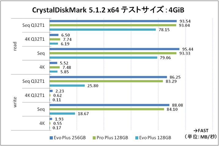 書き込みは「EVO Plus 256GB」が圧倒的な性能を見せつけた