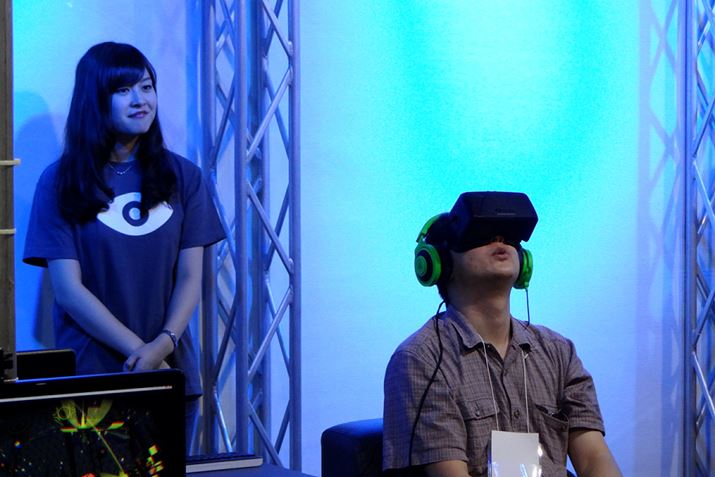 東京ゲームショー2014、オキュラスブースにて。「オキュラス・リフト」で、360型の全天球CG映像をデモ。頭の動きに合わせてスムースに変化する映像に、VR時代の到来を確信した