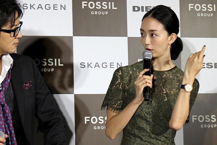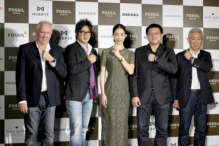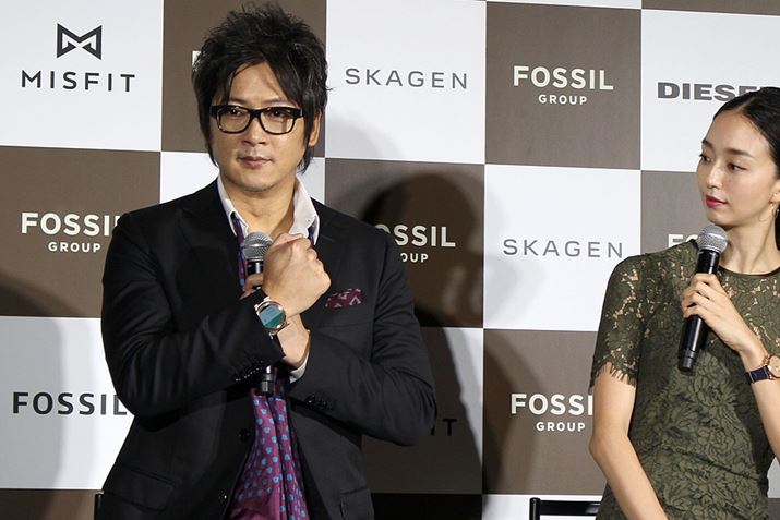 発表会では、フォッシルグループAPACシニアバイスプレジデントのジャック・クィンランさん(写真左)やMisfit創業者のサニー・ヴーさん(写真右から2番目)が登壇。今まで他メーカーから発売されてきたようなウェアラブル製品と違い、ファッションとテクノロジーの融合である「ファッションウェアラブル」であることを強調しました。ゲストとして、細川茂樹さん(写真左から2番目)、松島花さん(中央)も製品を身につけ登壇されました。写真右はフォッシルジャパン代表取締役の木村信也さん