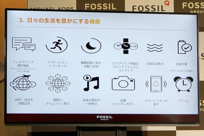 2016年9月20日、メンズ・レディースの時計やバッグなど、ファッション小物を展開している「Fossil Group, Inc.」の日本現地法人であるフォッシルジャパンは、東京・二子玉川の蔦屋家電にて、スマートウォッチ、ハイブリッドスマートウォッチ、トラッカーの3タイプのウェアラブル製品を発表しました。FOSSIL、Misfit、SKAGEN、DIESEL、EMPORIO ARMANI、kate spade new york、MICHSRL KORSの7ブランドから、全107機種が今年の秋以降、順次発売されます。