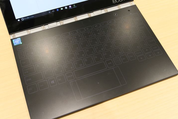 いっぽうのYOGA BOOKは、今年9月にドイツ・ベルリンで開催された家電見本市「IFA 2016」で発表した超薄型の2in1タブレット。物理的なキーボードを廃止し、独自の「Haloキーボード」を採用することで、9.6mmの超薄型ボディを実現している。レノボによると、2in1デバイスとしては世界最薄という。Haloキーボードは、ソフトウェアキーボードのように、板の上に表示されたキーボードをタッチして入力するが、タッチすると振動によるフィードバックがあり、ソフトウェアキーボードにありがちな不満を解消している。また、ユーザーの入力のクセを学習し、キーの位置を自動調整する機能も盛り込んでいる。これにより、打ち間違いを低減できるという。Haloキーボードの開発には、ThinkPadを開発する大和研究所のノウハウを活用。18.1mmのキーピッチを確保し、ThinkPadと同じキー数としている。なお、単純なソフトウェアキーボードではないため、英語配列と日本語配列を切り替えるといった使い方は残念ながらできないという。