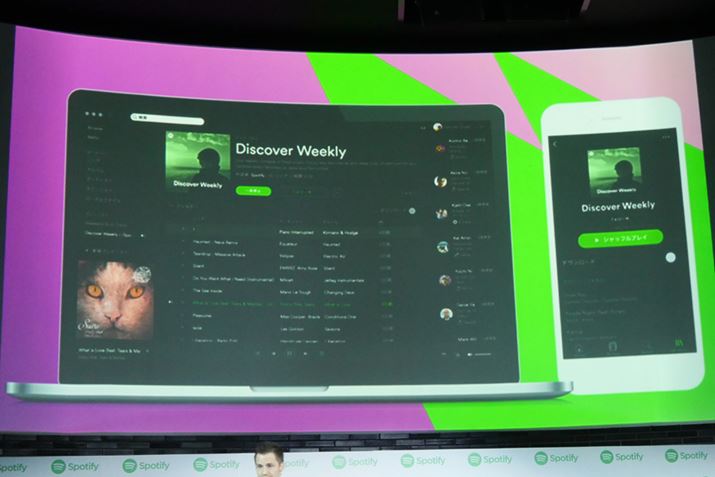 Spotifyは数多くのプレイリストを楽しめるのも大きな魅力。その数は20億本以上もあるというほど。加えて専門家が選りすぐったというプレイリストもあり、日本にもスタッフを置いてすでに100万本以上を用意しているとのことだ。その中には初音ミクといったものも用意されている。さらに、パーソナライズ機能として、毎週月曜日に更新されるユーザーの視聴履歴に基づいて抽出される楽曲をまとめた「Discover Weekly」や、フォローしたりひんぱんにチェックしていたりするアーティストの新曲を集めた「Release Rader」といったプレイリスト機能も用意されている。なお、作成したプレイリストは、LINEやTwitterを通じて、友人とすぐシェア可能だ。