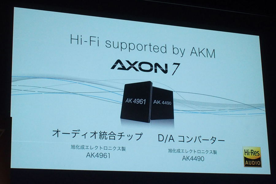 AXON 7とAXON 7 miniは、同社の旗艦モデルとして、サウンドにこだわったスマホだ。数十万円するハイエンドオーディオに使われる旭化成エレクトロニクスのオーディオ専用チップを搭載し、クリアで高音質な再生と録音を実現している。D/Aコンバーターには、30万円以上するAstell&Kernのポータブルオーディオプレーヤー「AK380」でも使われている「AK4490」を採用する(AXON 7 miniは「AK4962」)。約8mmの薄型のきょう体にオーディオ専用チップを搭載し、その能力をすべて発揮できるように、部品の選定、基板のレイアウト、ノイズ対策には苦労したという。旭化成エレクトロニクスの小瀧敬氏は、「音楽家にも納得してもらえるような音に仕上がっている。高級オーディオの音をスマホで楽しんでもらいたい」と説明した。