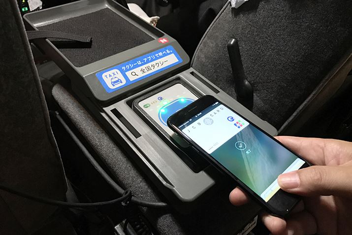 タクシーでApple Payを体験。Touch IDに指を置いて端末に近付けるだけで、一瞬で決済が終わる。リーダーに近付けるのは、アンテナのあるiPhoneの上部。Touch IDに親指を登録しておけば、自然な持ち方で支払いができそうだ