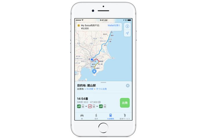 純正のマップアプリでは、ルートともに電車料金も表示される。Suicaの残高が不足している場合は、Apple Payに移動してチャージできる導線が用意される