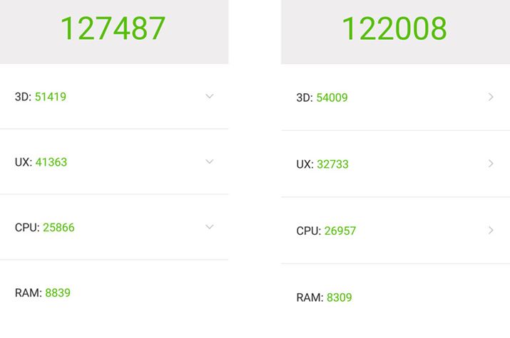 ベンチマークアプリ「Antutuベンチマーク」の総合スコアは、127487。右の「Xperia X Performance」のスコア122008と比較すると、計測誤差の範囲内と言えよう