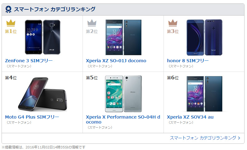 図1:「スマートフォン」カテゴリーにおける人気ランキング上位6製品(2016年11月2日時点)