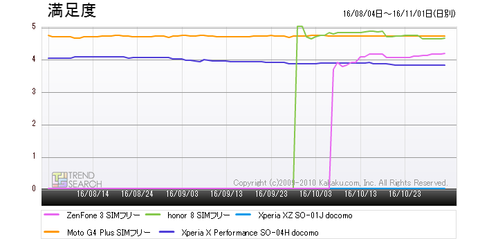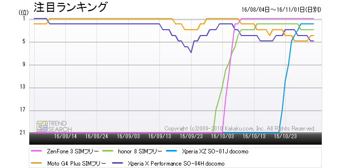 図2は、「価格.comトレンドサーチ」で見た、「スマートフォン」カテゴリーにおける人気5製品の人気ランキング推移を示したもの。これを見ると、夏から人気が続いている、ソニー「Xperia X Performance SO-04H」と、モトローラ「Moto G4 Plus」の2機種に、9月以降に発売となったSIMフリーモデルASUS「ZenFone 3」、Huawei「honor 8」がからみ、さらに本日発売となった、ソニー「Xperia XZ SO-01J」が加わるという展開になっていることがわかる。冬モデルという意味で注目なのは、「ZenFone 3」「honor 8」「Xperia XZ」の3製品と言っていいだろう。