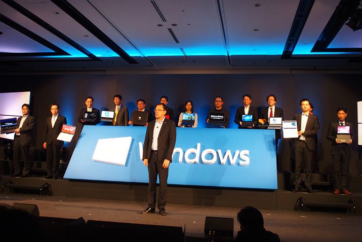 国内でパソコンを販売しているメーカーが一堂に会し、年末商戦のイチオシモデルをアピール。中央は日本マイクロソフトの平野社長