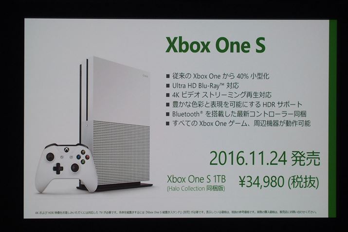 パソコンではないが、海外で発売済みのXbox One Sを11月24日に発売することも発表された。従来の「Xbox One」では外部にあったACアダプターを本体に内蔵しつつ、体積を約40%小型化したモデル。「Halo:The Master Chief Collection」(ダウンロード版)と「Halo 5」(ディスク版)を同梱する。Ultra HD Blu-rayドライブを内蔵し、プレーヤーとして利用できるほか、HDR(High Dynamic Range)をサポートしており、対応のゲームとテレビがあれば、薄暗い部分から明るい部分まで、より自然な表現が可能だという。参考価格は34,980円(税別)。